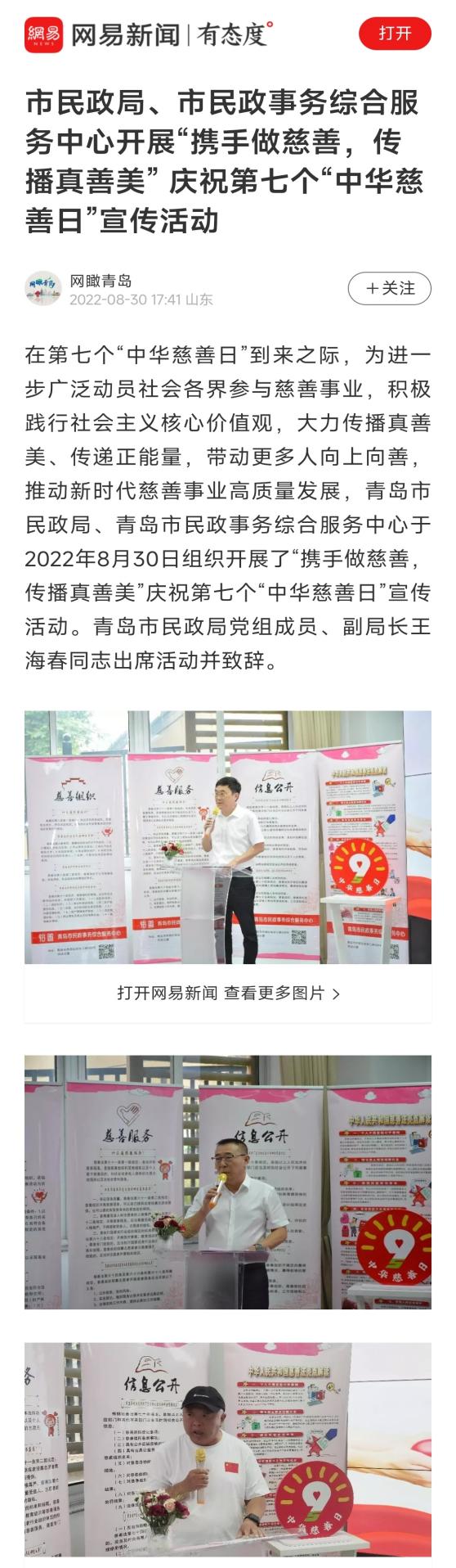 網(wǎng)瞰青島(網(wǎng)易號(hào))2022-8-30:市民政局、市民政事務(wù)綜合服務(wù)中心開展慶祝第七個(gè)“中華慈善日”宣傳活動(dòng)