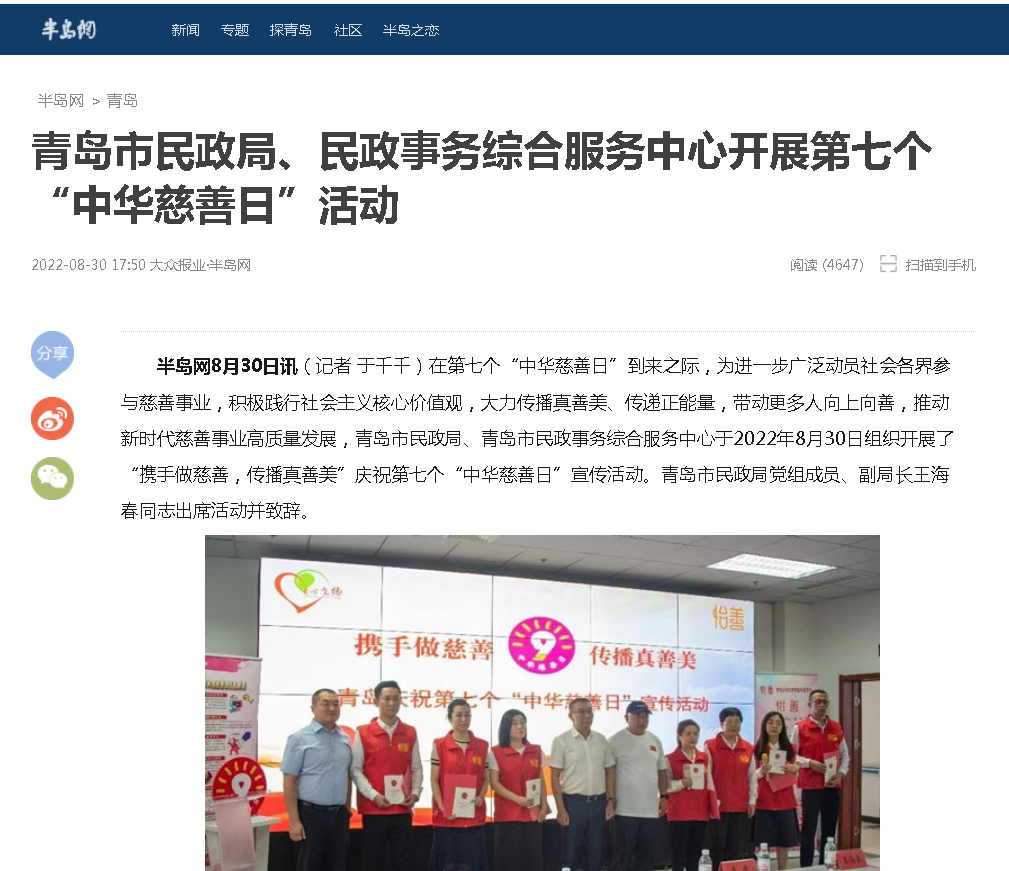 半島網(wǎng)2022-8-30:青島市民政局、民政事務(wù)綜合服務(wù)中心開展第七個(gè)“中華慈善日”活動(dòng)