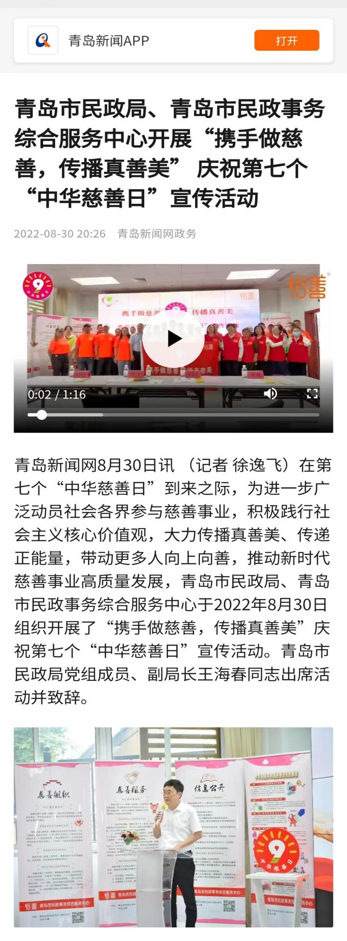 青島新聞網(wǎng)2022-8-30:青島市民政局、青島市民政事務(wù)綜合服務(wù)中心開展慶祝第七個(gè)“中華慈善日”宣傳活動(dòng)