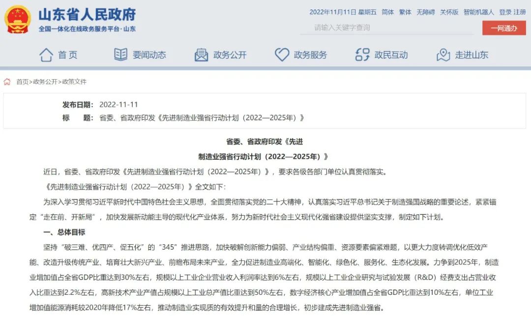 近日,山東省委、省政府印發(fā)《先進制造業(yè)強省行動計劃(2022—2025年)》(下稱《行動計劃》),力爭到2025年,制造業(yè)增加值占全省GDP比重達到30%左右,推動制造業(yè)實現(xiàn)質(zhì)的有效提升和量的合理增長,初步建成先進制造業(yè)強省。