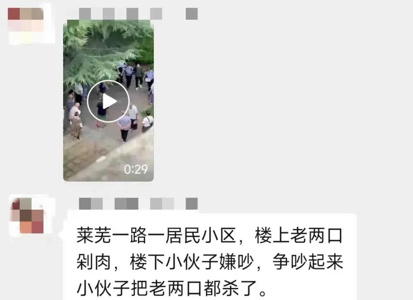 8月7日下午,青島地區部分微信群中出現一則搭配“萊蕪一路一居民小區,樓上老兩口剁肉,樓下小伙子嫌吵,爭吵起來小伙子把老兩口都殺了。”字樣的視頻內容,引發社會關注。