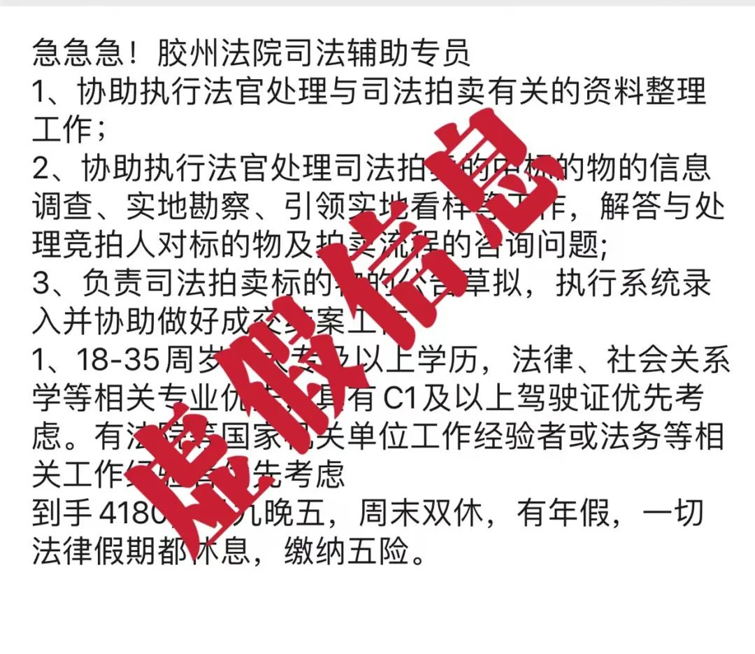 8月23日,膠州法院發現不法分子在微信朋友圈發布關于“膠州法院招聘司法輔助專員”的虛假招聘信息,并向求職者索要數萬元的高額手續費。該信息并非膠州法院發布,已第一時間向公安機關報案。