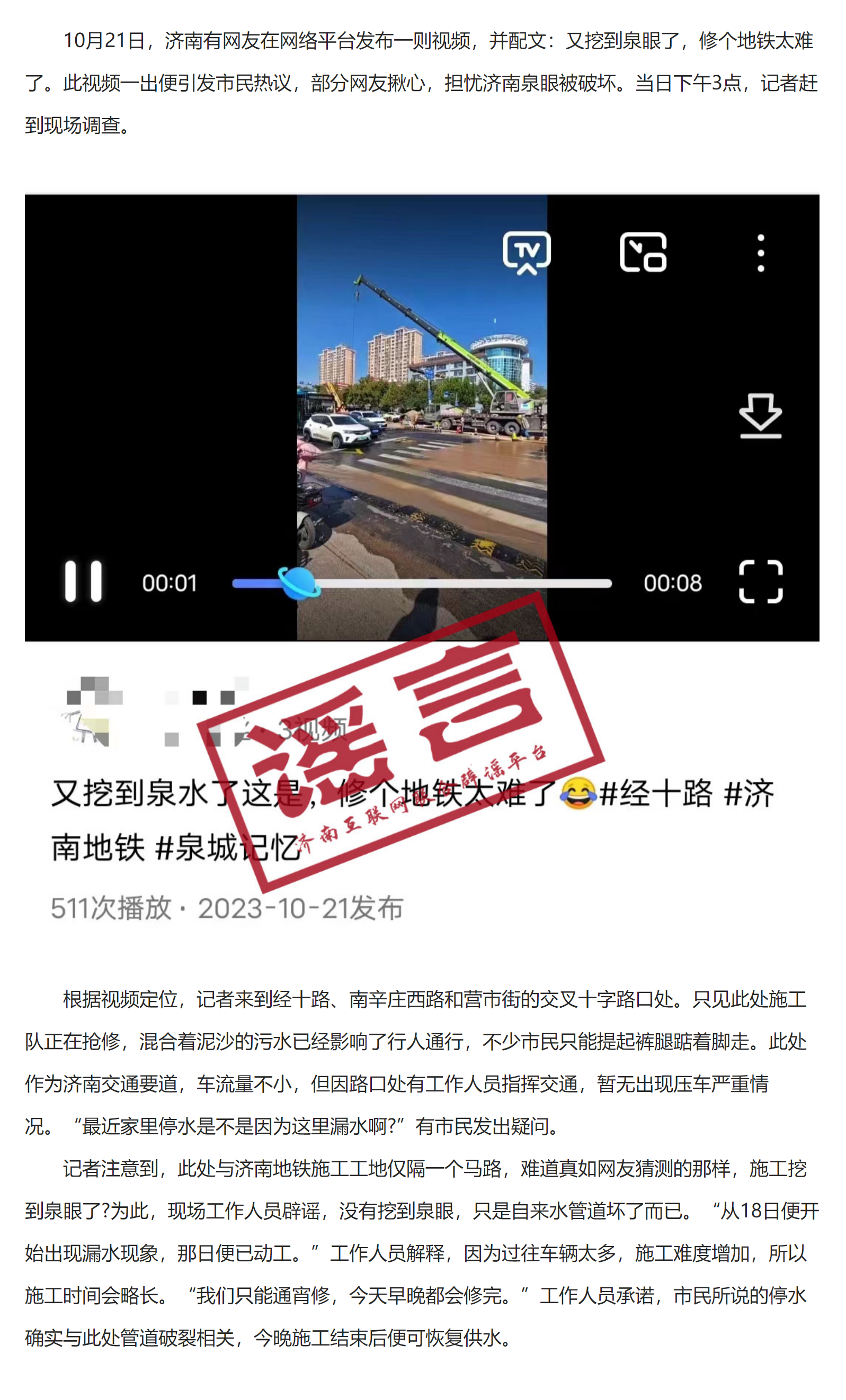 濟南地鐵施工遇泉眼?施工人員:自來水管道壞了而已