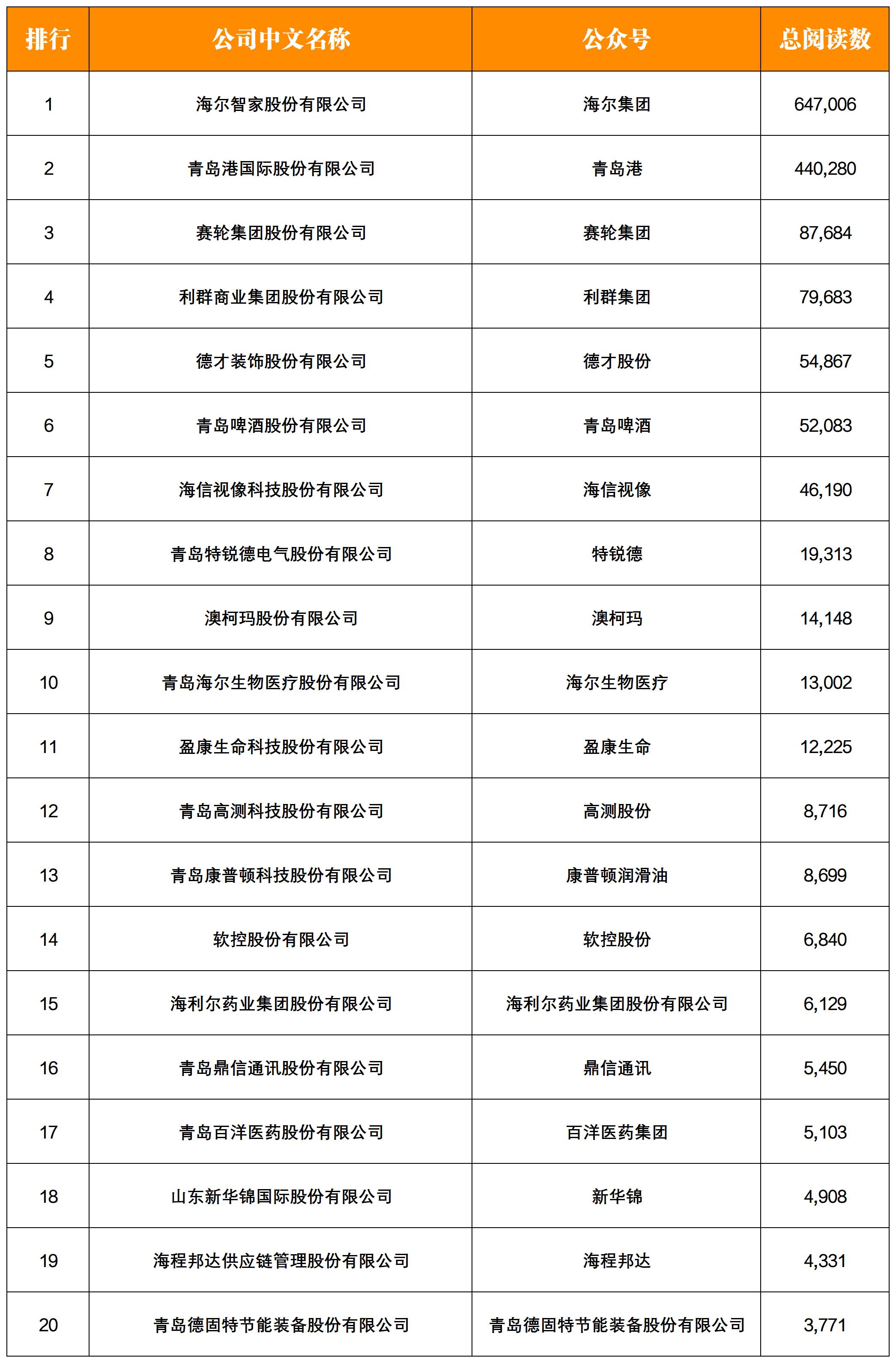 NO.2| 權威發布:青島上市企業微信影響力月度排行榜TOP20