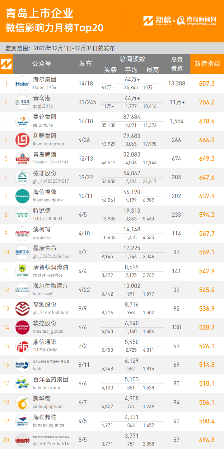 NO.12| 權威發布:青島上市企業微信影響力月度排行榜TOP20