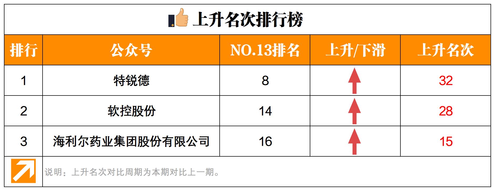 上升名次排行榜排名變化較大,本期前三名分別是:“特銳德”、“軟控股份”、“海利爾藥業集團股份有限公司”。