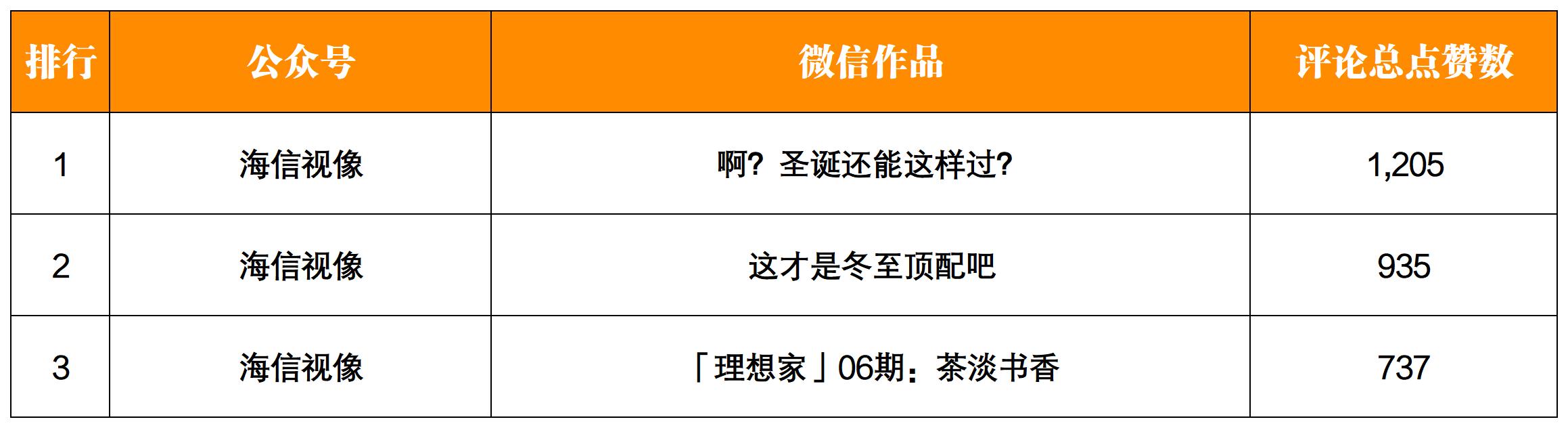 本期單篇作品最高評論總點贊數1205,出自賬號“海信視像”的《啊?圣誕還能這樣過?》一文;排行第二篇、第三篇推文也均出自于賬號“海信視像”,評論總點贊數分別為935和737,我們來看下出彩的作品: