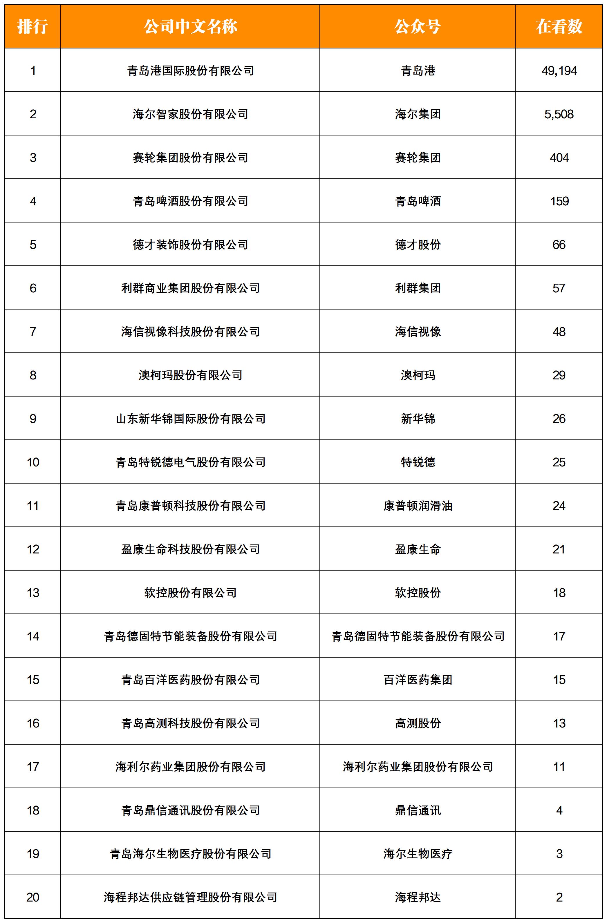 本期登上分榜單總在看數前三的青島上市企業是:“青島港”、“海爾集團”、“賽輪集團”。