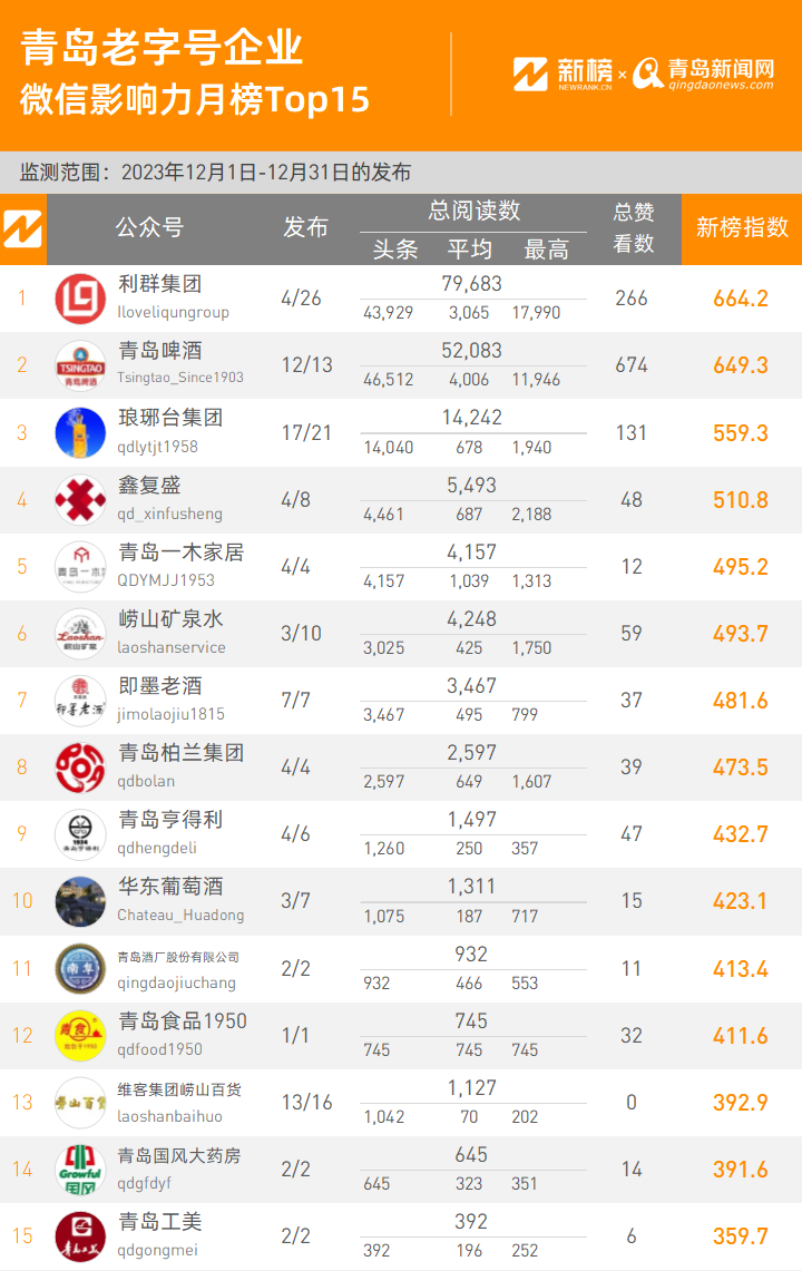 NO.12|權威發布:青島老字號企業微信影響力月度排行榜TOP15