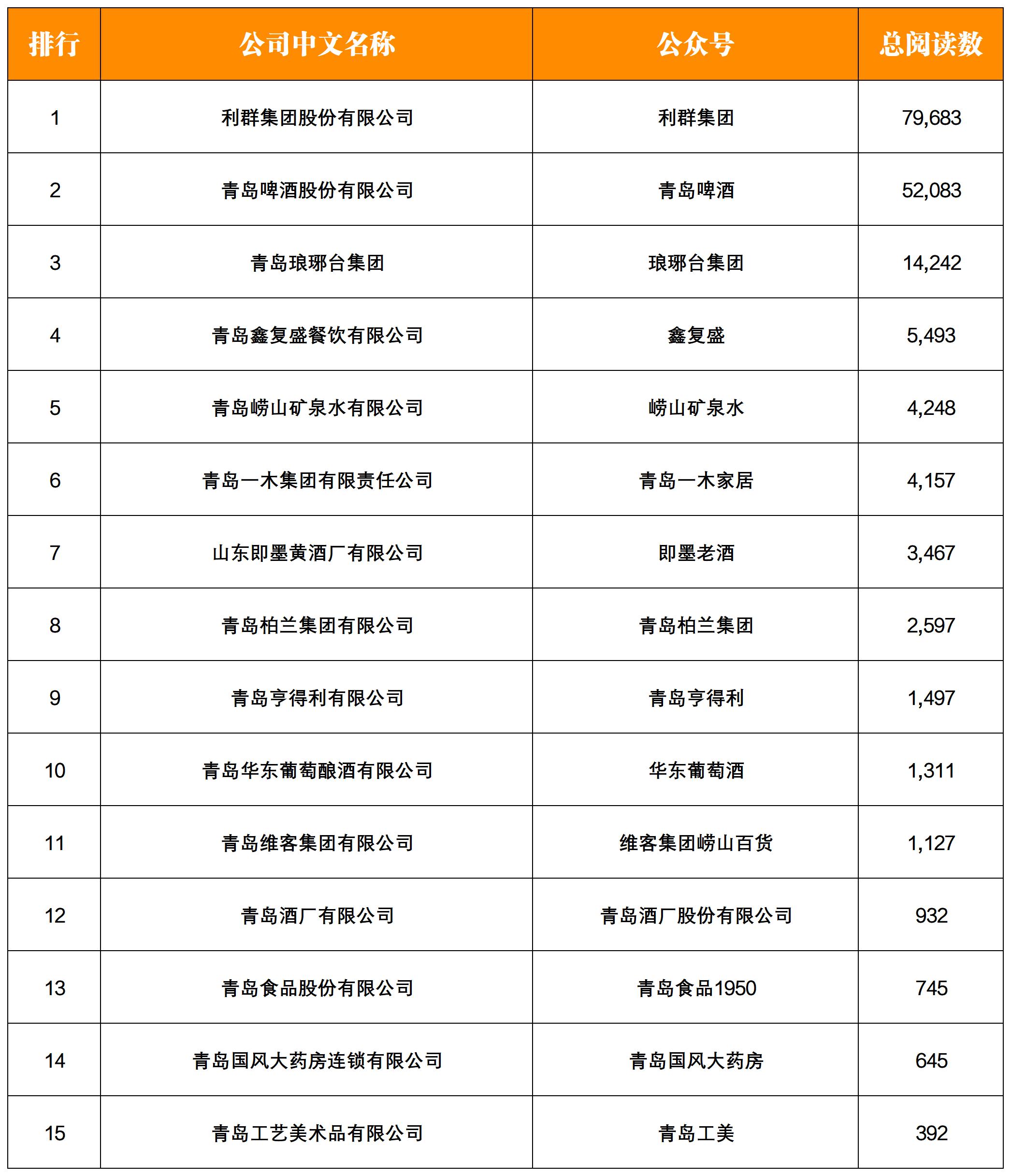 NO.1|權威發布:青島老字號企業微信影響力月度排行榜TOP15