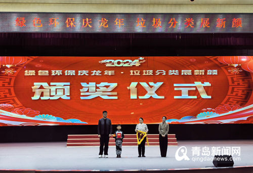 與會領導為在青島市中小學生垃圾分類短視頻征集活動中獲獎的環保小衛士及其家長頒獎,以表彰他們為垃圾分類做出的貢獻。