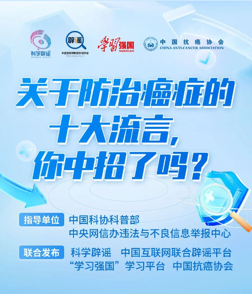 今天,科學(xué)辟謠聯(lián)合中國(guó)互聯(lián)網(wǎng)聯(lián)合辟謠平臺(tái)、“學(xué)習(xí)強(qiáng)國(guó)”學(xué)習(xí)平臺(tái)、中國(guó)抗癌協(xié)會(huì),針對(duì) 10個(gè)廣為流傳的有關(guān)“防治癌癥”的流言進(jìn)行解讀,快看看你中招了沒(méi)?