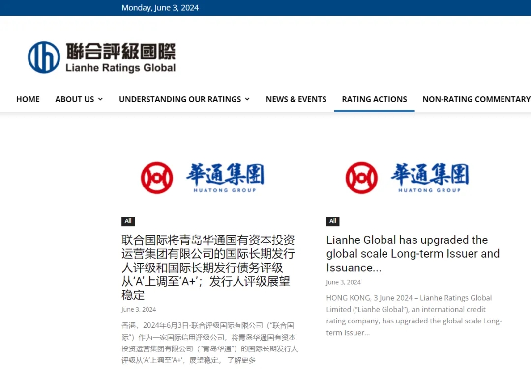 6月3日,聯合評級國際有限公司(以下簡稱“聯合國際”)正式宣布,確認將青島華通國有資本投資運營集團有限公司(以下簡稱“華通集團”)的國際長期發行人評級由“A”上調至“A+”、展望“穩定”。這是聯合國際目前在山東省內授予企業的最高等次評級結果,也是華通集團自今年2月獲得惠譽國際評級提升后的又一次晉檔躍升。