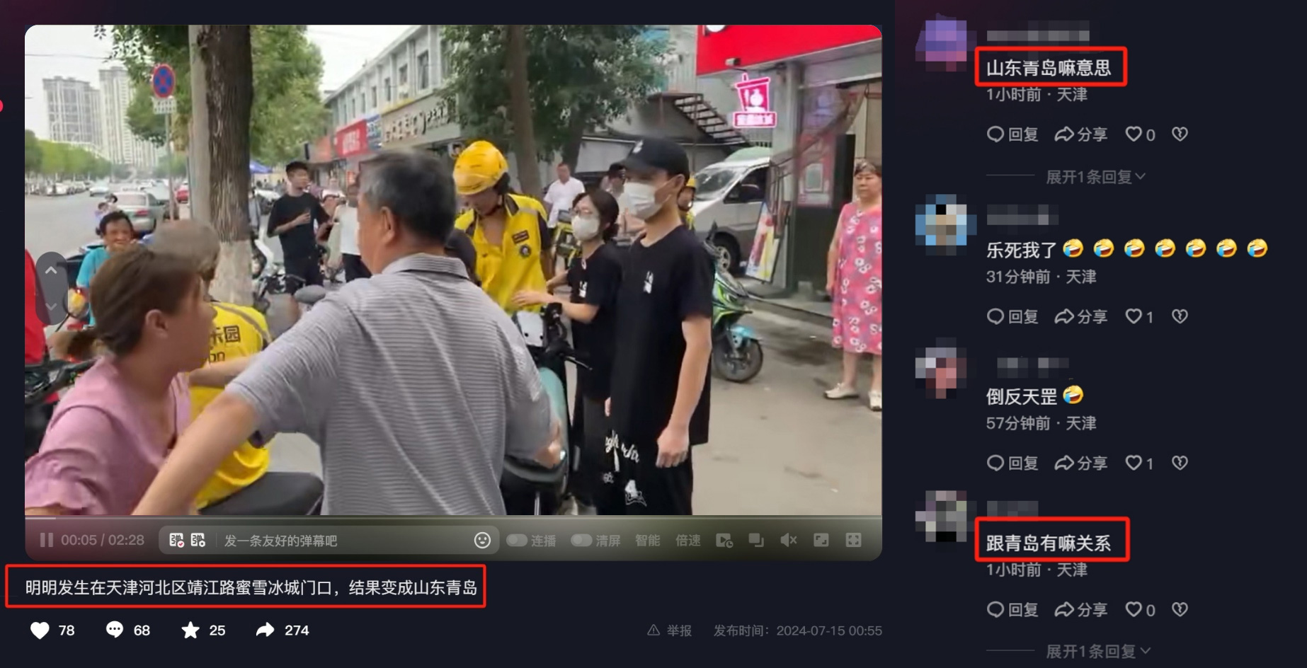 記者聯(lián)系上了該事件完整視頻的發(fā)布者。該網(wǎng)友表示,視頻中的事件發(fā)生地點為天津市某連鎖飲品店的門口,并非發(fā)生在山東省青島市。而且在視頻的標題文案和網(wǎng)友評論中,也提到“明明發(fā)生在天津,結(jié)果變成山東青島”“跟青島有嘛關(guān)系”。